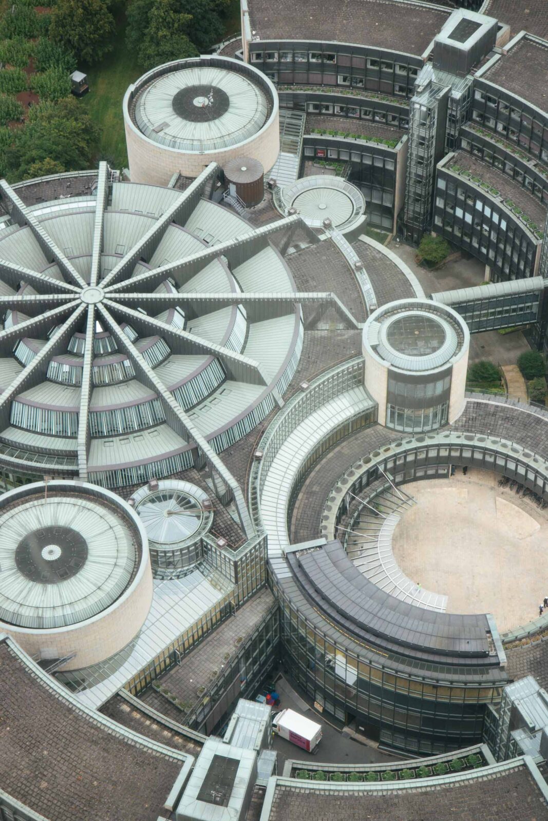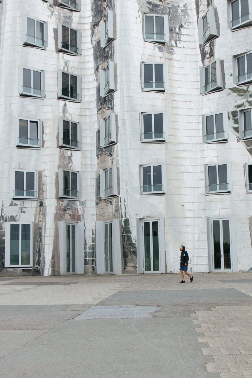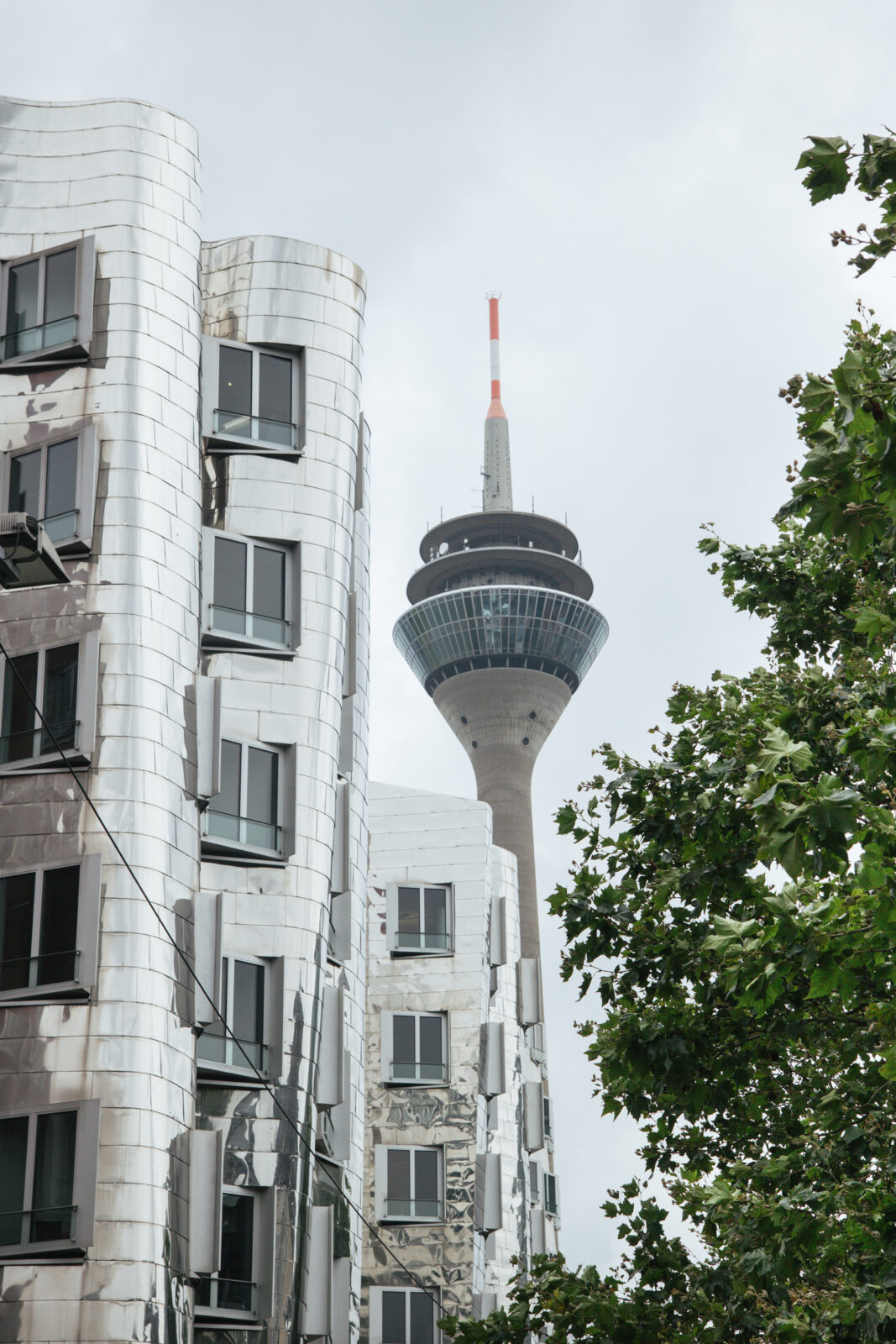 Der nächste Morgen beginnt im „25 Hours Hotel Das Tour“, wo ich beim Frühstück einen atemberaubenden Blick über die Stadt genieße. Doch es gibt viel zu entdecken! Mit der Straßenbahn fahre ich in den Süden Düsseldorfs – zum Medienhafen. Schon gestern aus dem Bus hat mich die Architektur der Gehry-Bauten beeindruckt. Keine Linie scheint hier gerade zu sein, vor allem das mittlere Gebäude mit seiner Spiegelfassade wirkt wie ein Spielplatz für meine Kamera.