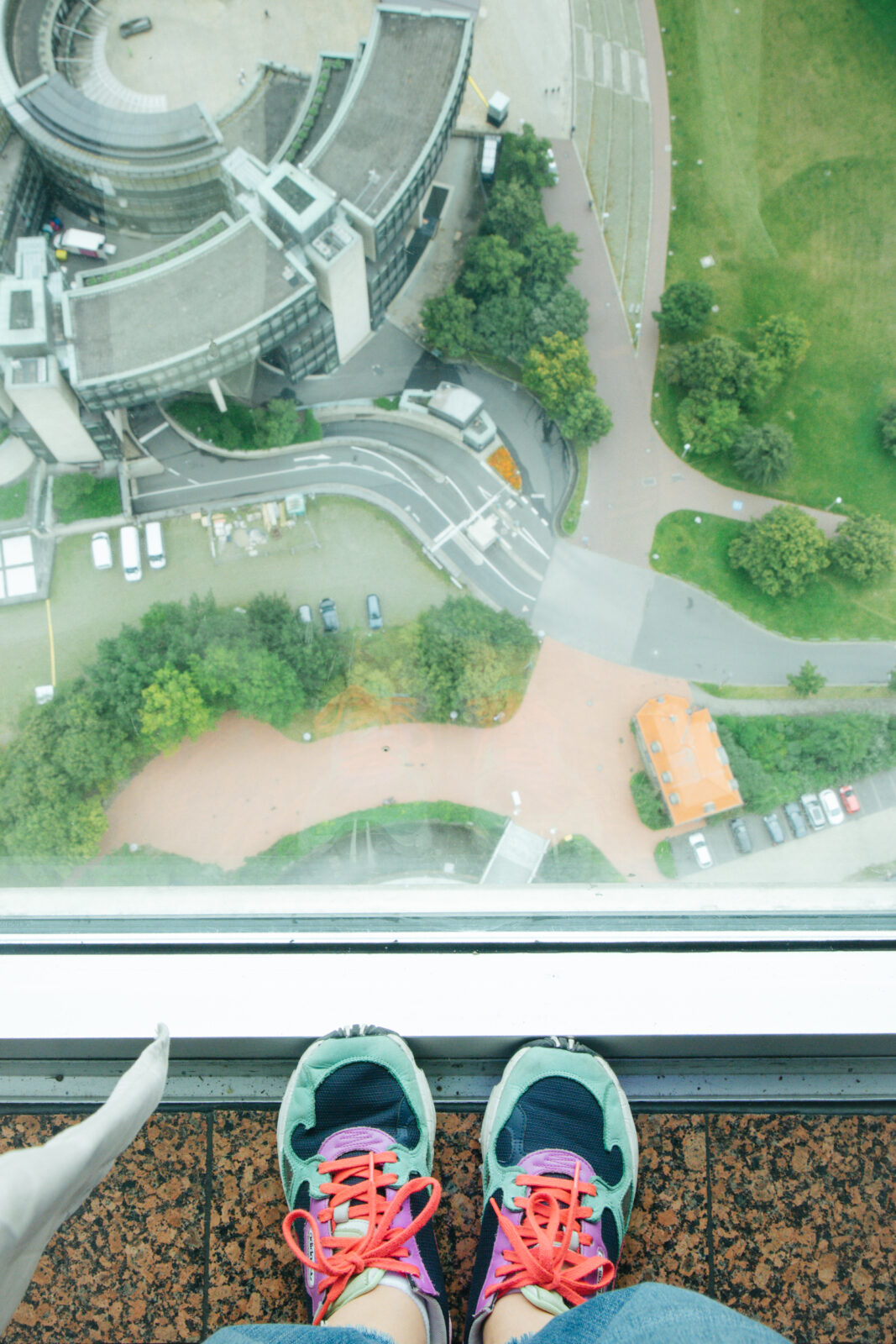 Von hier ist es nur ein kurzer Spaziergang zum Rheinturm. Als Kind war ich schon einmal oben und erinnere mich daran, wie ich mich einfach auf die schrägen Scheiben gelegt habe, um nach unten zu sehen. Ob ich das heute noch schaffe? Der Aufzug saust in die Höhe, meine Ohren knacken. Auf 168 Metern erwartet mich eine spektakuläre 360-Grad-Aussicht – bei guter Sicht erkennt man sogar den Kölner Dom. Aber psst… das sollte man hier lieber nicht zu laut sagen!