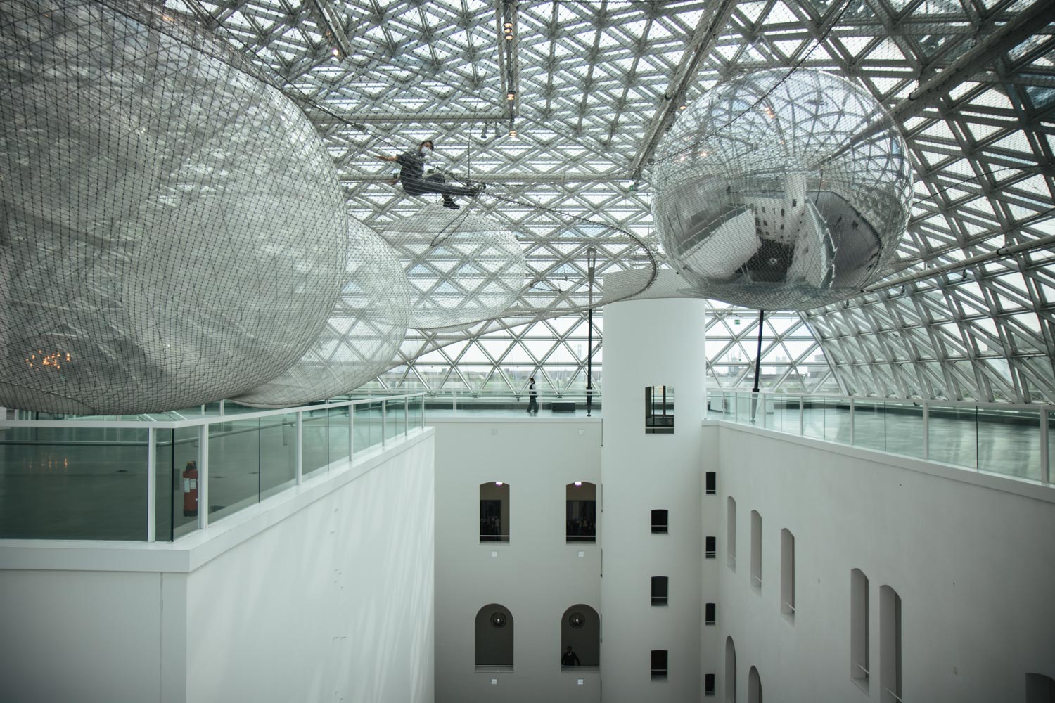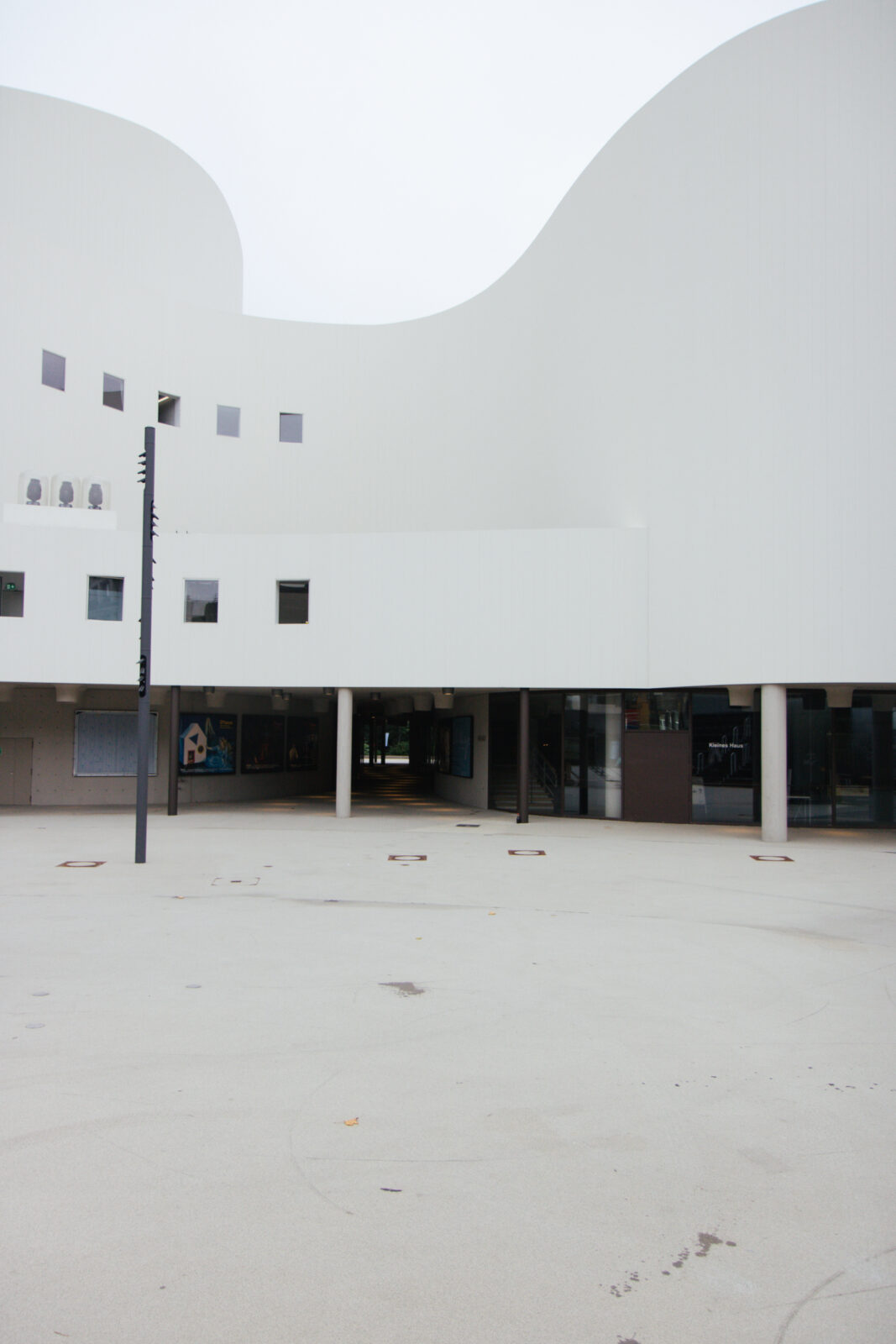 Ein paar Pfützen später erreiche ich das K21 im Ständehaus, idyllisch in einem kleinen Park gelegen. Die riesige Glaskuppel beherbergt „in orbit“, eine begehbare Netz-Installation von Tomás Saraceno. Leider habe ich keine passenden Schuhe dabei, um sie zu betreten – für alle mit Höhenangst lohnt sich das Zuschauen aber auch! Neben der Installation gibt es hier faszinierende zeitgenössische Kunst von Ai Weiwei, Wolfgang Tillmans und Simone Nieweg. Besonders beeindruckt mich eine Sound-Installation von Carsten Nicolai, bei der ein schwarz-weißes Rastermuster scheinbar durch Klang tanzt.